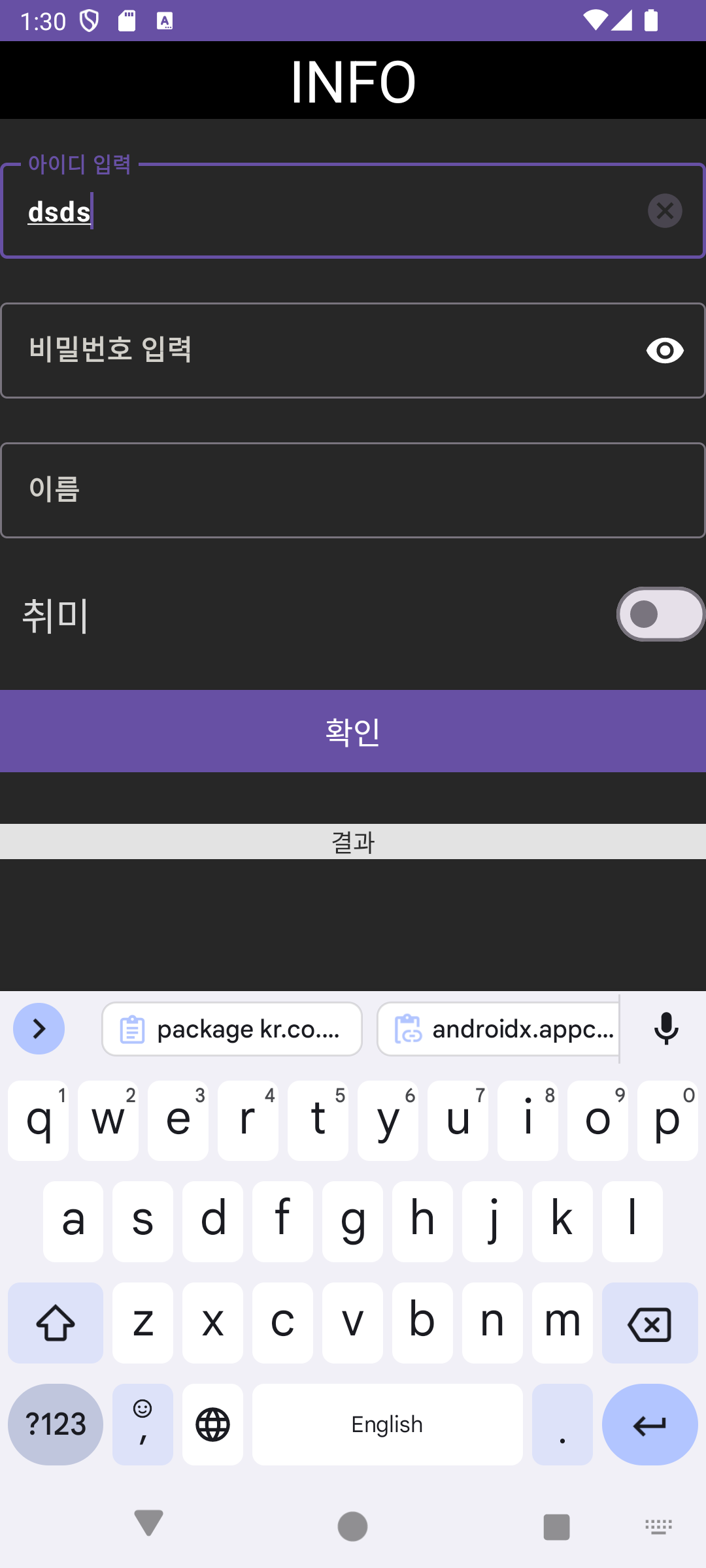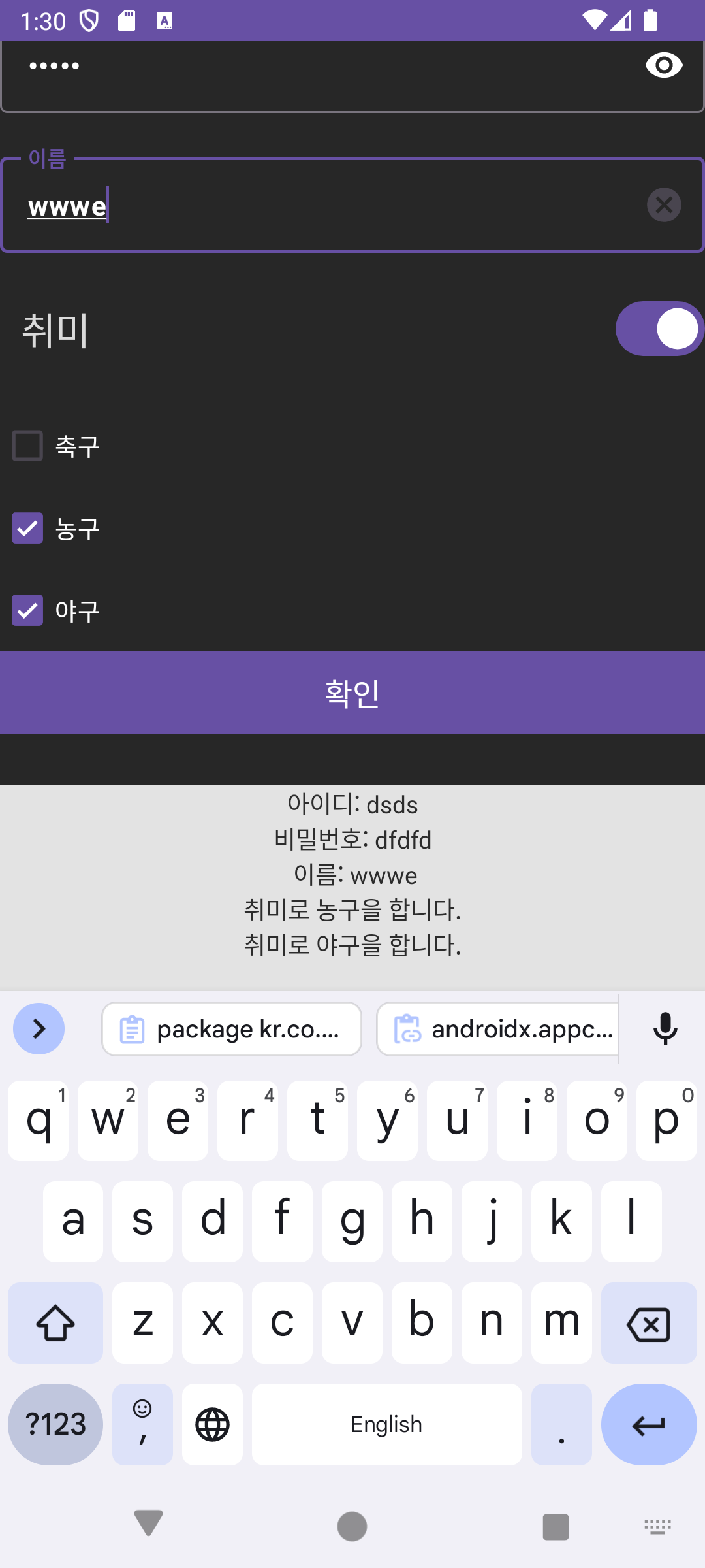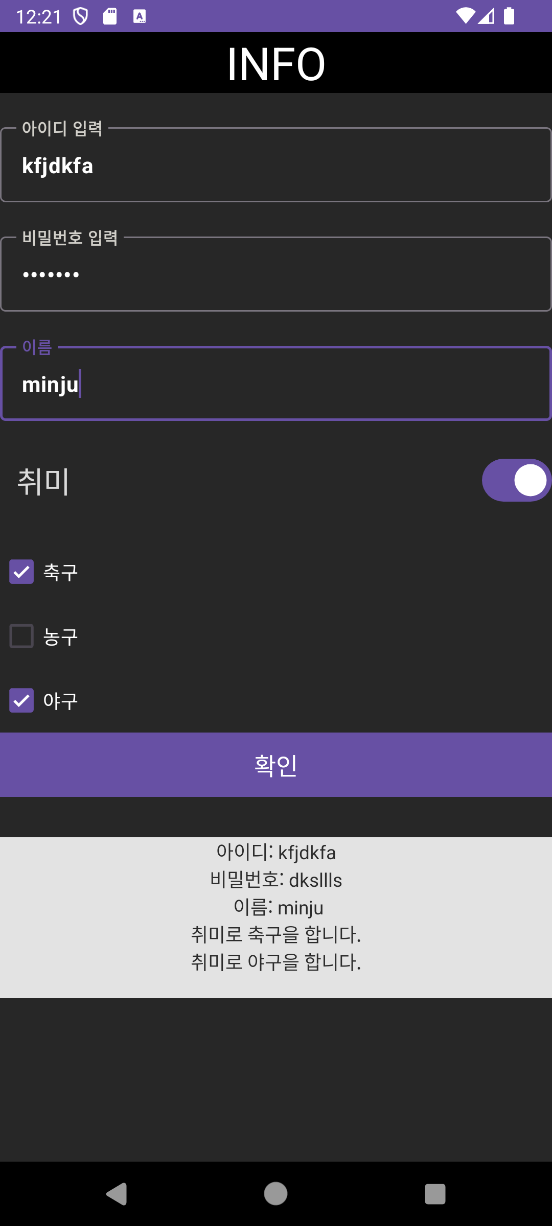 4. 확인 버튼을 누르면 입력한 정보가 출력된다.