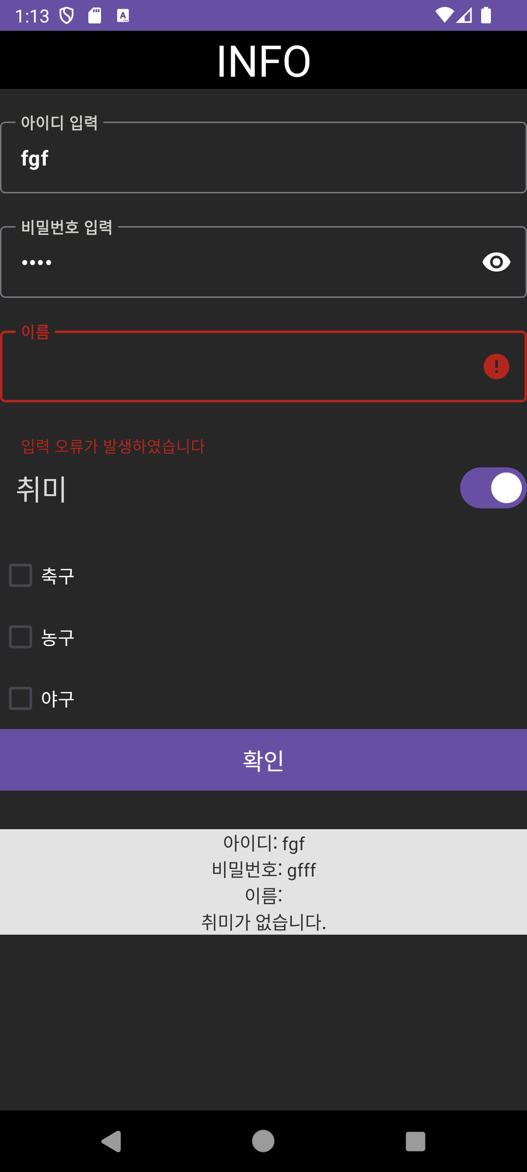 2. 취미의 Switch버튼을 눌러 on이 되면 CheckBox가 보인다.