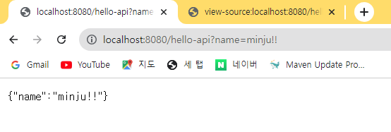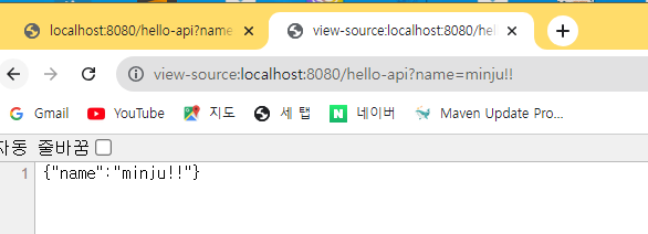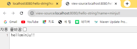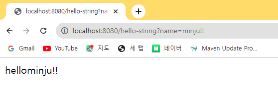 -> 컨트롤러: @ResponseBody, return hello(name:minju!!)