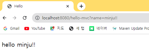 위와 같이 localhost:8080/hello-mvc?name=minju!! 에서 name에 minju!!라는 String값을 넣어 View에 보이게 했다.