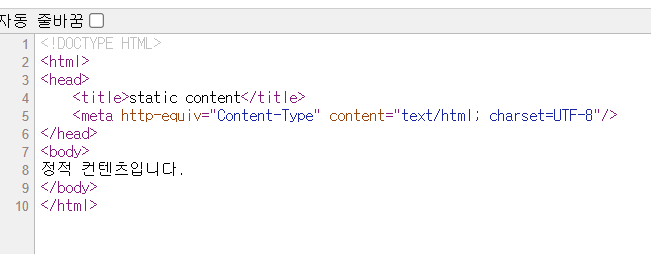 클라이언트에 반환된 페이지 소스를 보면 알 수 있듯이 html파일의 코드 그대로 반환됐다.