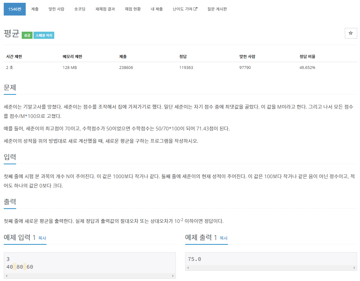 정수로 입력받아야한다는 조건이 있는데 평균은 실수로 나와야 한다.